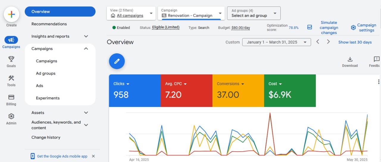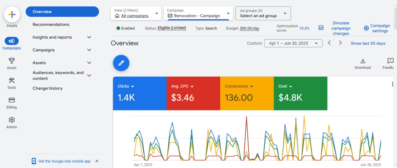We also built an optimized lead form funnel that minimized friction and encouraged quick submissions. Every element—from the headline to the call-to-action—was tested and refined for performance. Our targeting was hyper-local, ensuring ads reached homeowners actively interested in renovations.